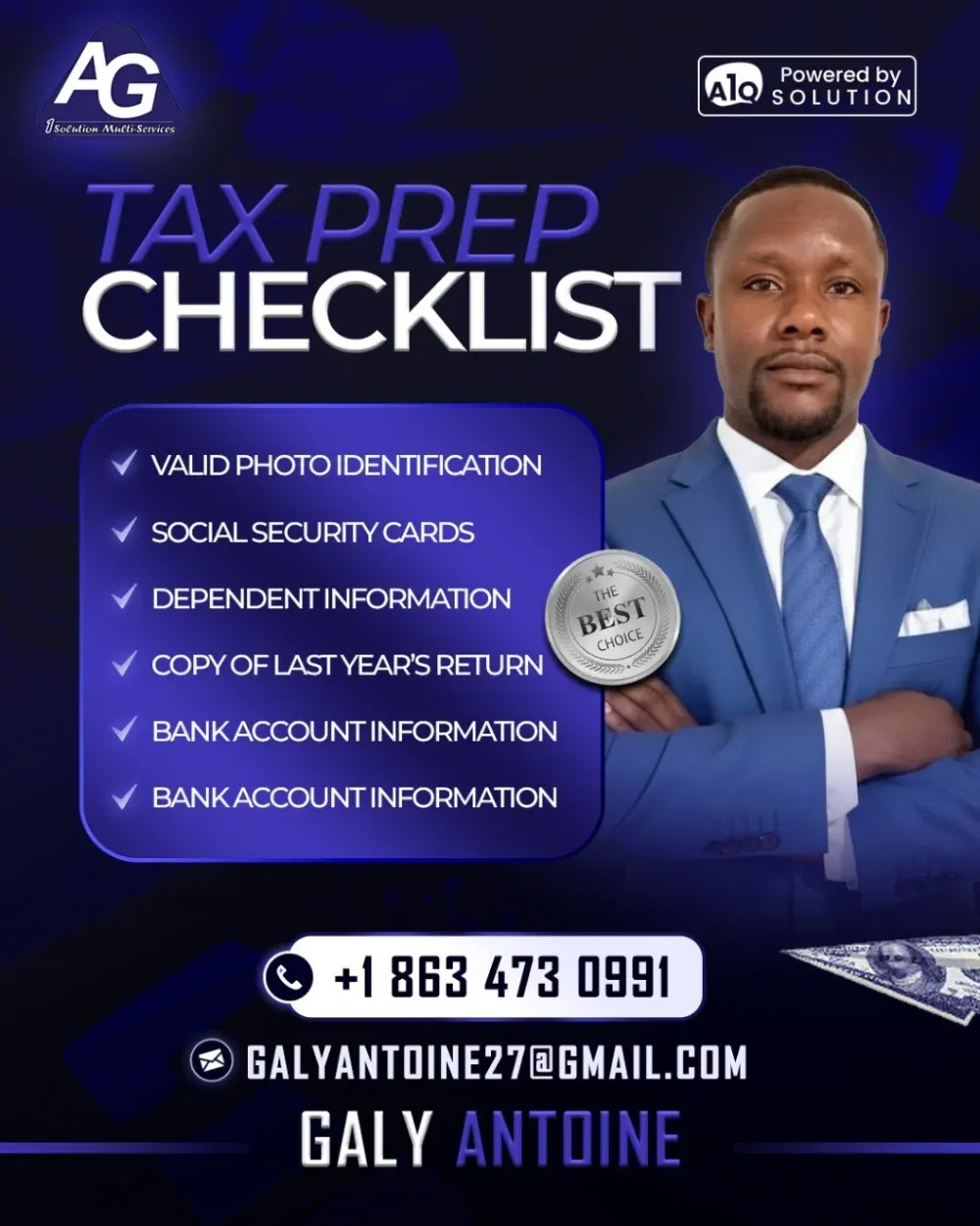 Thank you for choosing AG 1Solution Multiservices LLC for your tax filing needs! We’re excited to serve you. Please complete the intake form as thoroughly as possible. If you have any questions or need assistance, feel free to email us at [email protected] or call +1 863 4730 991.